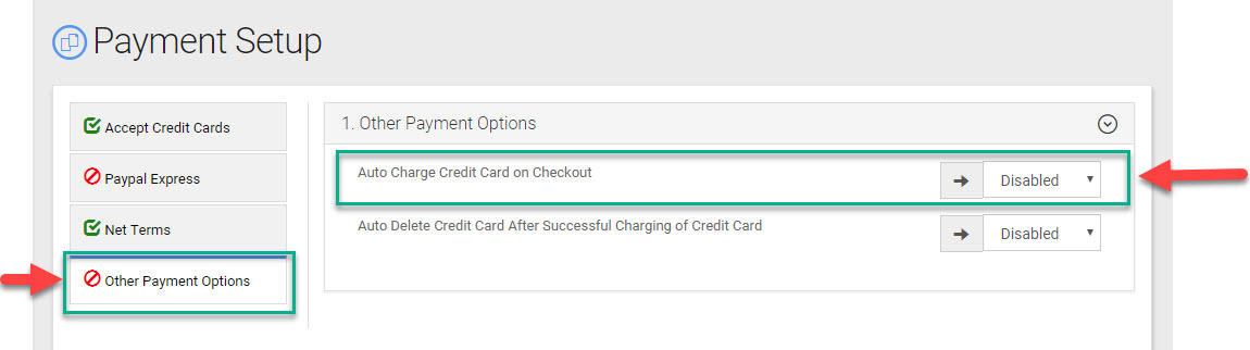 - Here you will see the option labeled "Auto Charge Credit Card on Checkout"