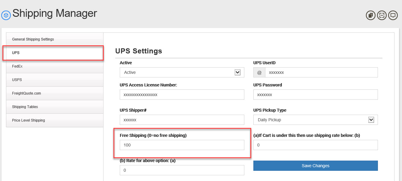 - Set the "Free Shipping (0=no free shipping)" to $100 and all order over or equal to $100 will be given free ground shipping.