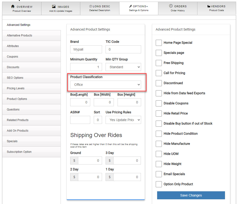 - Click on the "Options" Tab and look for the drop down menu "Product Classification".
