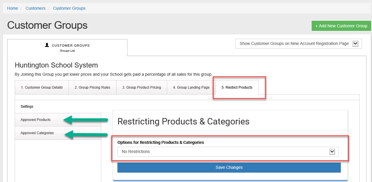 - "Restricting to Approved Products" : By selecting this option only Approved products can be viewed or bought by members of this Group.